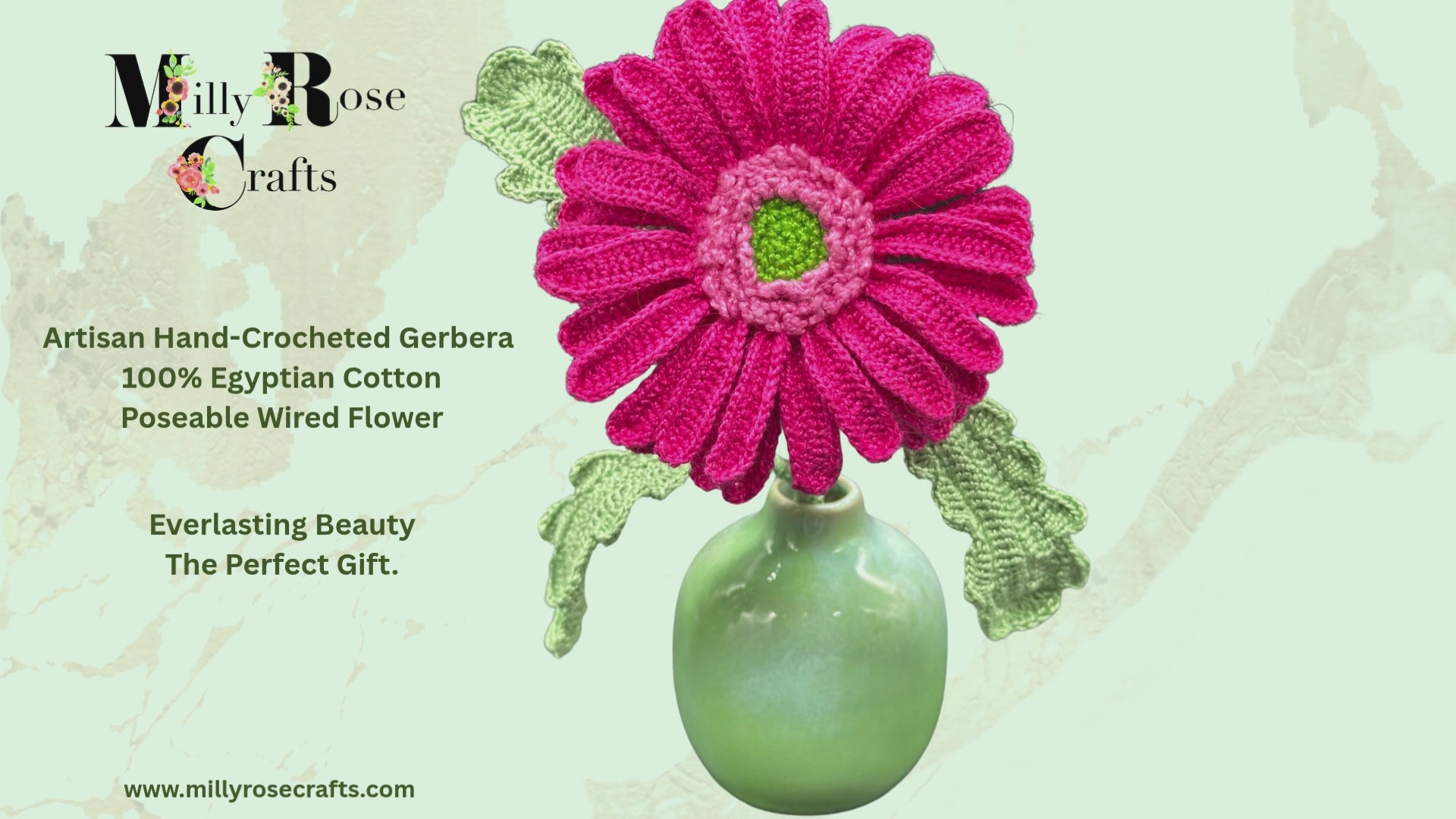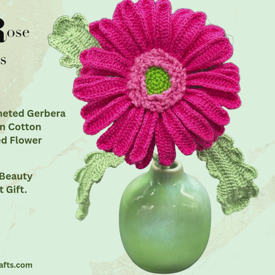 The Eternal Bloom Bring a burst of everlasting colour into your home with our exquisitely handcrafted, hand crocheted Gerbera. Meticulously crocheted using premium 100% Egyptian Cotton, this flower offers a soft, natural lustre and a luxury finish that fresh flowers simply can't match.
