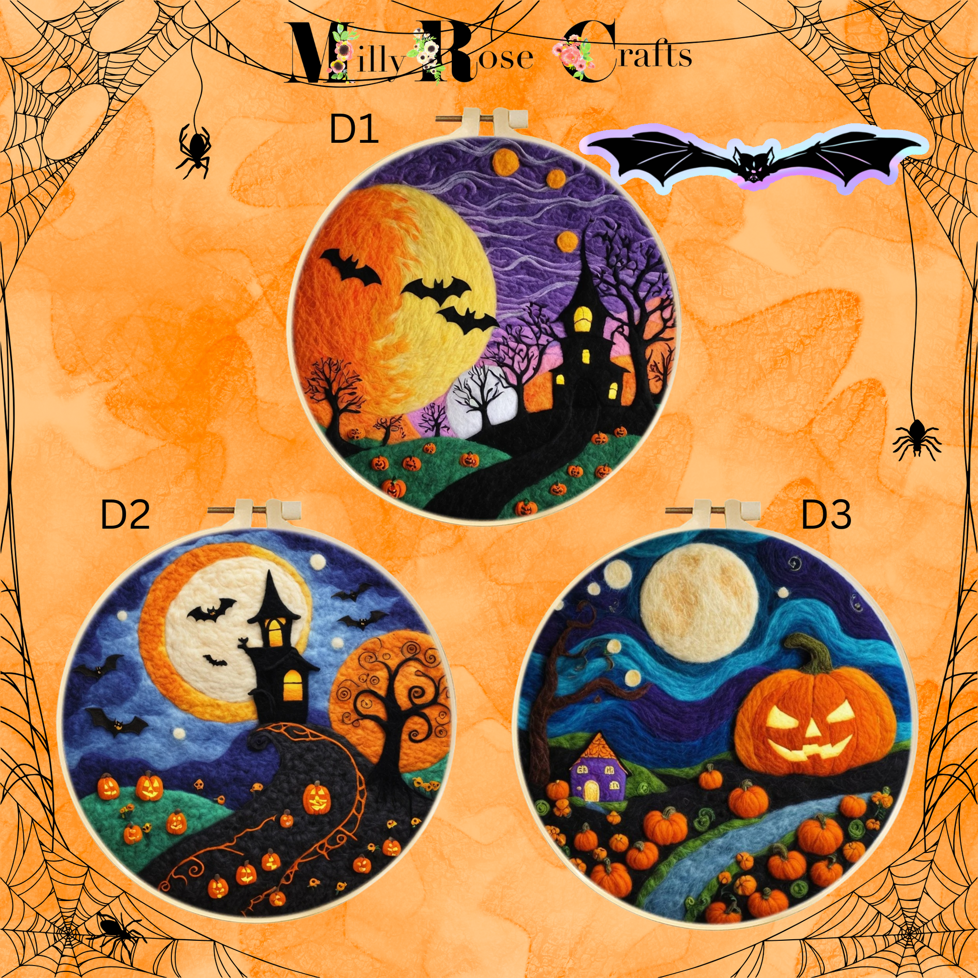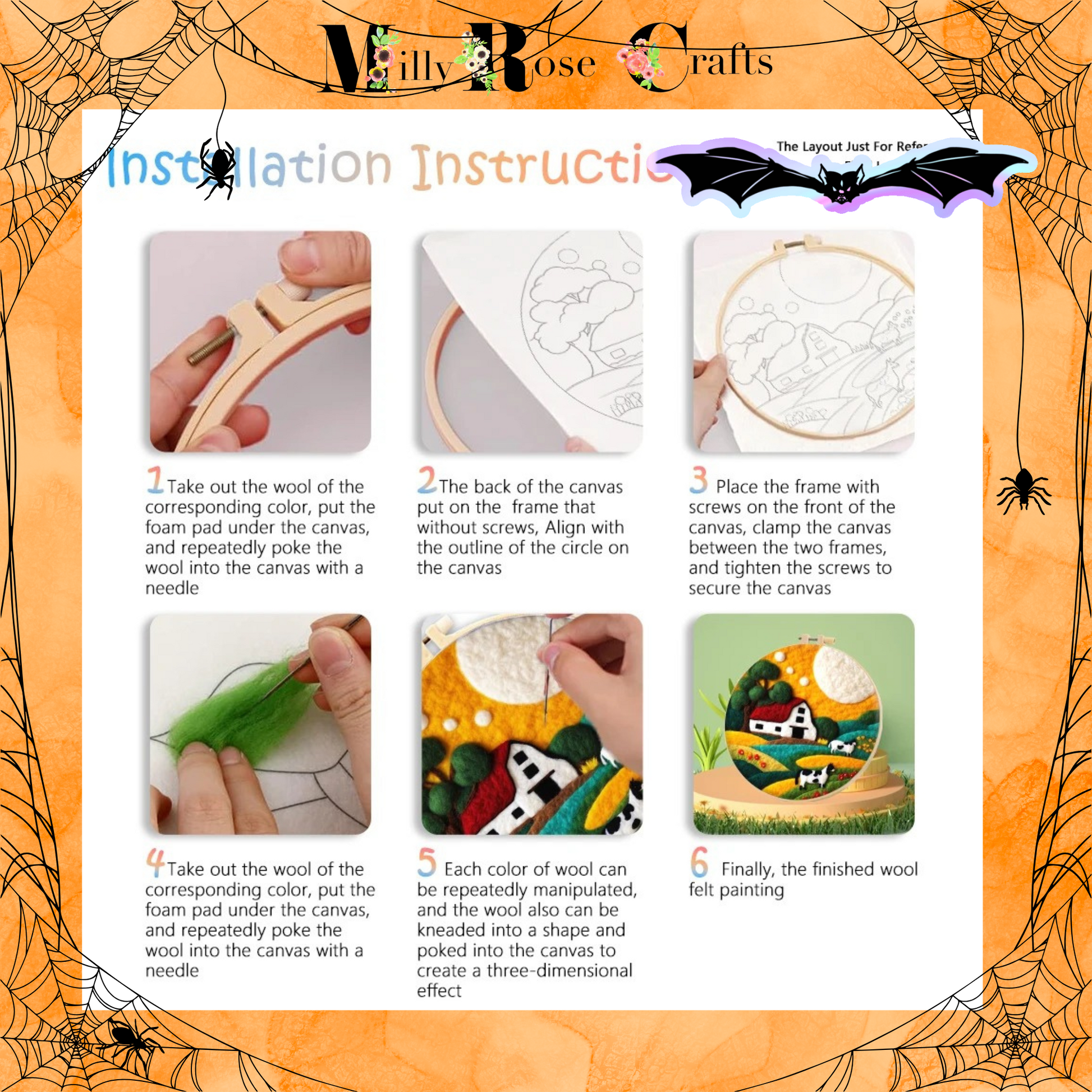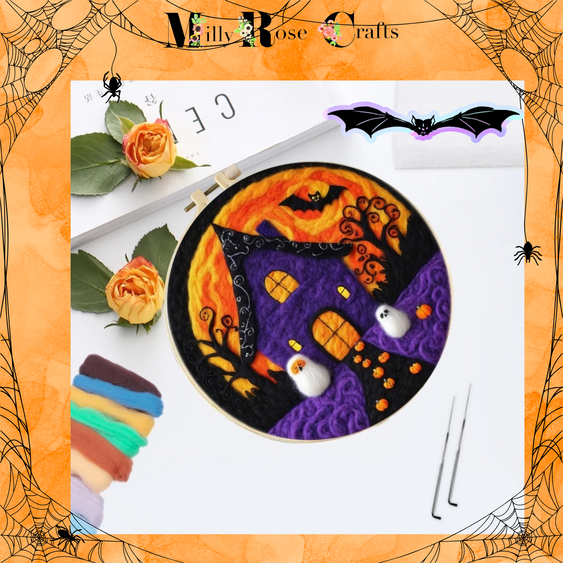 Spooky Halloween 2D Needle Felting Kit Set 1 Adult Beginner Bats Pumpkin Haunted House Wool Painting Kit Complete Felting Kit Craft Gift Idea