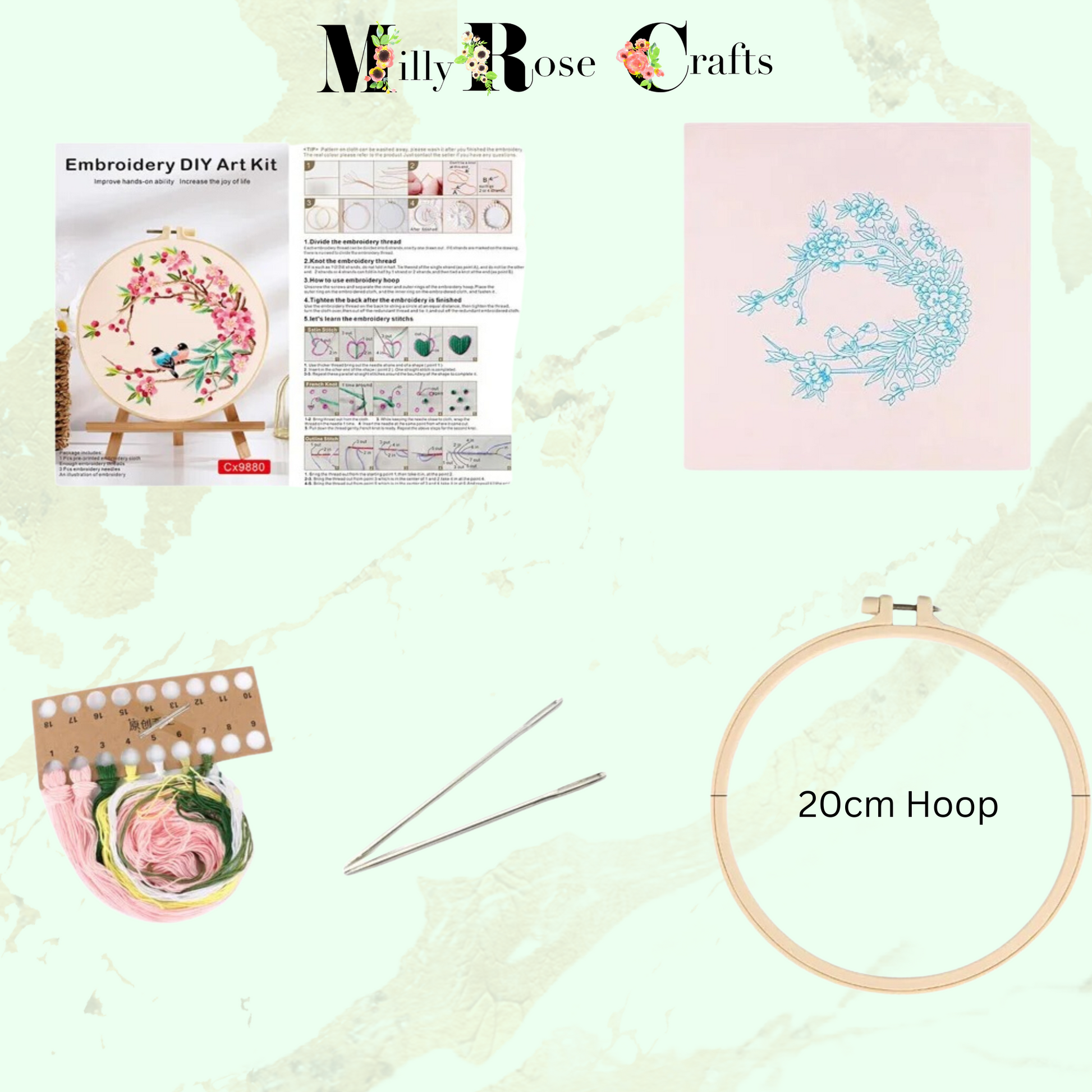 Each kit includes high-quality materials, such as pre-printed embroidery cloth, a 20cm embroidery hoop, and an assortment of premium threads. With easy-to-follow instructions, you'll master simple stitches like the satin stitch and French knots in no time.